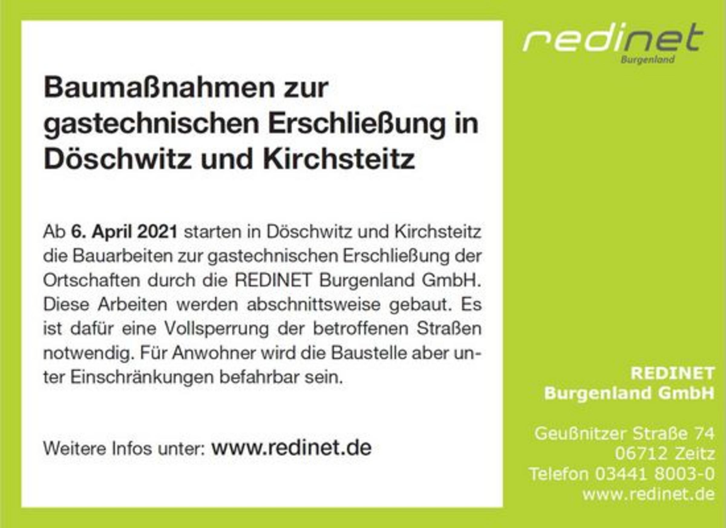 Ab 6. April starten in Döschwitz und Kirchsteitz die Bauarbeiten zur gastechnischen Erschließung der Ortschaften durch die REDINET Burgenland GmbH. Diese Arbeiten werden abschnittsweise gebaut. Es ist dafür eine Vollsperrung der betroffenen Straßen notwendig. Für Anwohner wird die Baustelle aber unter Einschränkungen befahrbar sein. Insgesamt werden bei der Baumaßnahme in Döschwitz knapp 1,5 Kilometer und in Kirchsteitz 2,4 Kilometer Gasleitung verlegt. Zurzeit ist der Bau von insgesamt 61 Gashausanschlüssen geplant. Weitere Interessenten für einen Gasanschluss in diesen Orten können sich noch bei der REDINET Burgenland unter 03441-8003-0 melden.
